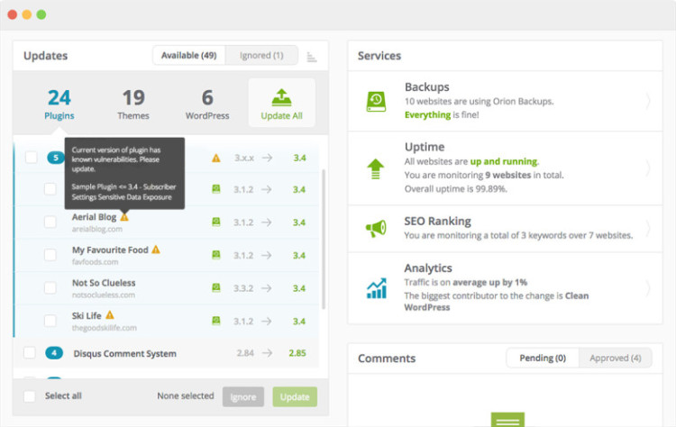 All the plugin, theme and WordPress core updates are compiled into a single, intuitive list. Update them with one click, put them on the ignore list, bulk install, deactivate, or install an older version over the current one – the choice is all yours.
