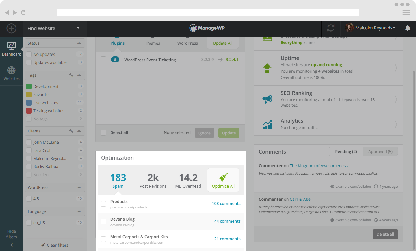 - Websites: Shows all your websites, with options for bulk management and assigning tags and clients.