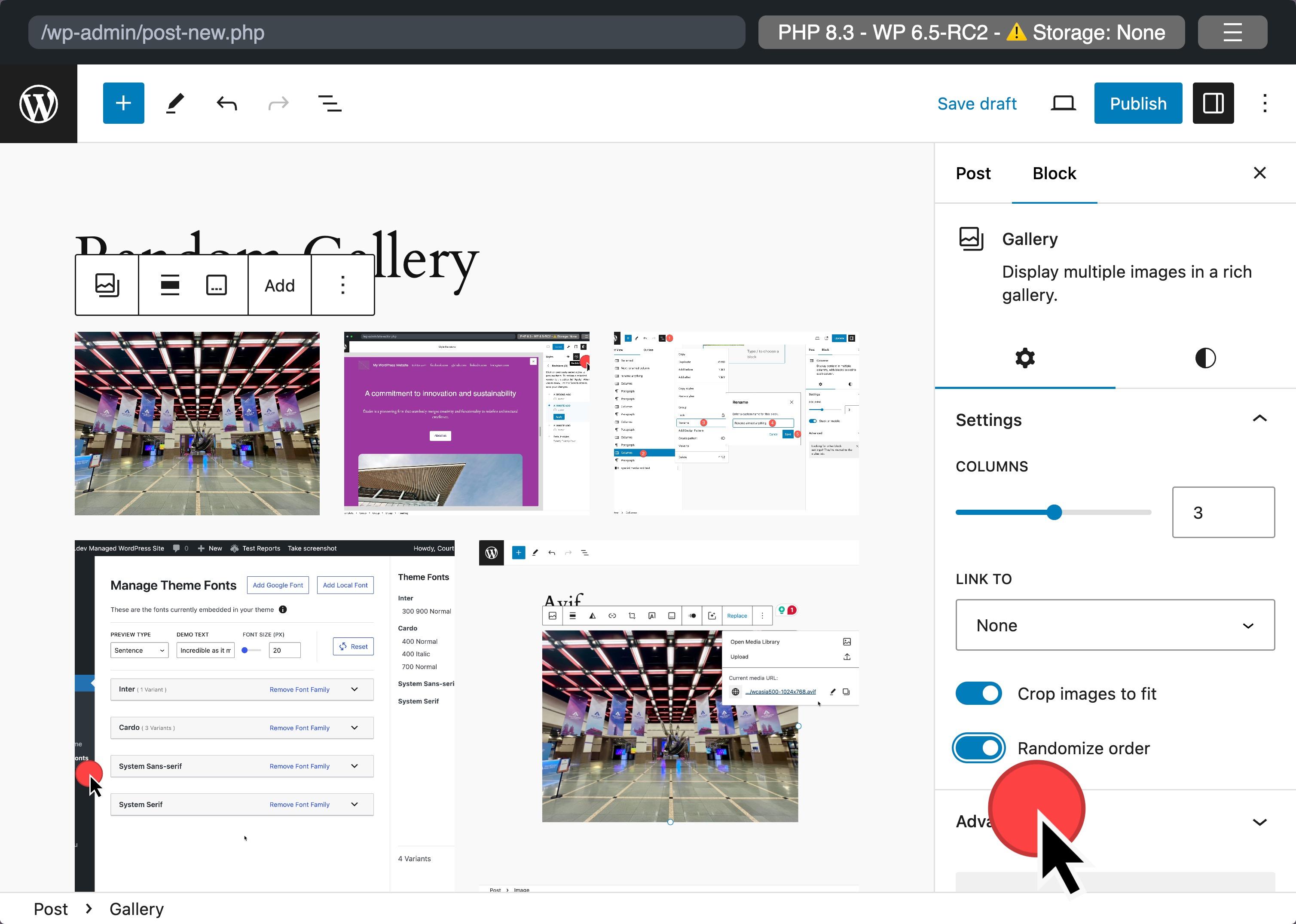 A new setting in the Gallery block lets you display images randomly, creating a unique viewing experience with each page reload. You can activate this feature for each gallery individually, adding a layer of dynamism to image presentations.